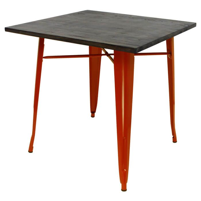 Tolix Style Dining Table - 80cm Square - Gloss Orange with Wooden Top - Dark Oak