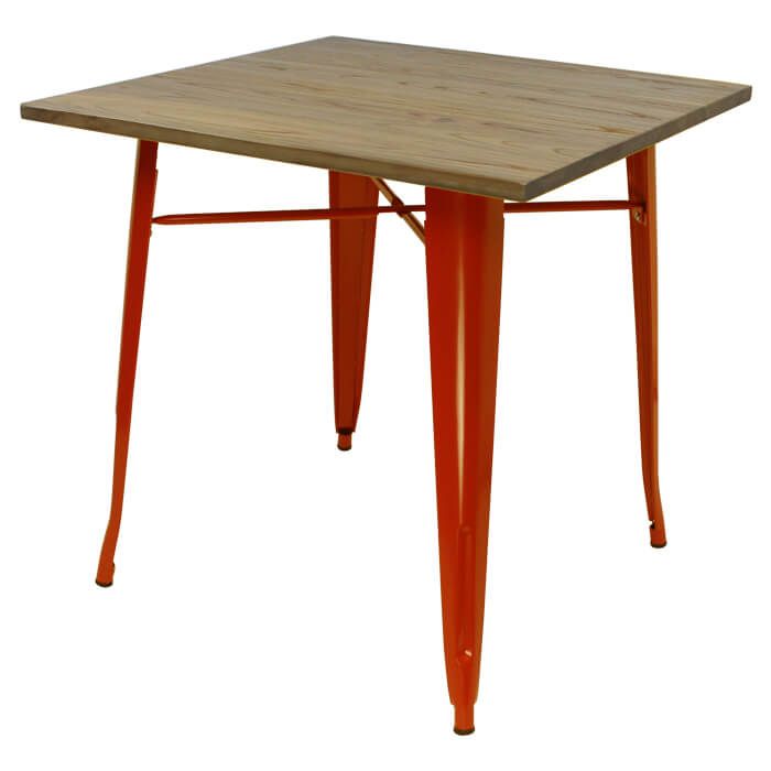 Tolix Style Dining Table - 80cm Square - Gloss Orange with Wooden Top - Light Oak