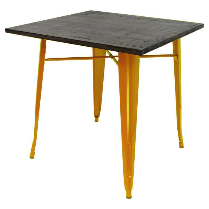 Tolix Style Dining Table - 80cm Square - Gloss Yellow with Wooden Top - Dark Oak