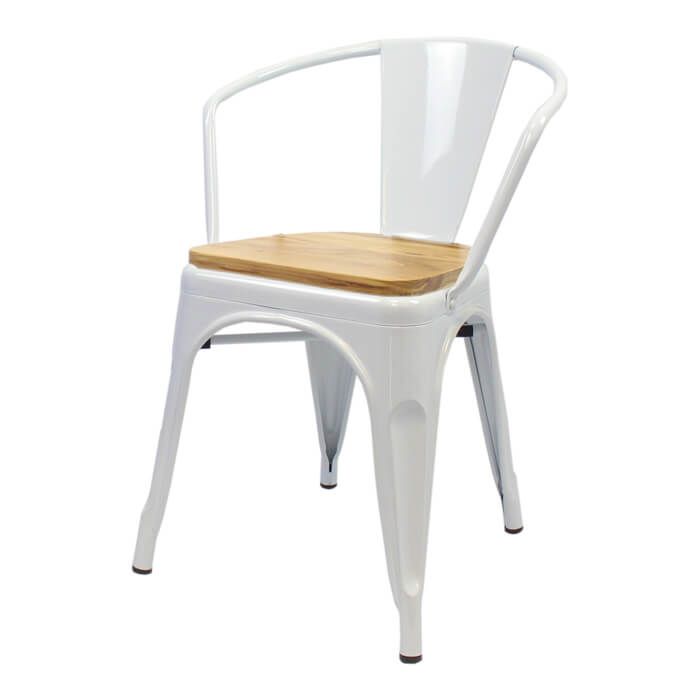Tolix Style Bistro Armchair with Wooden Seat | White